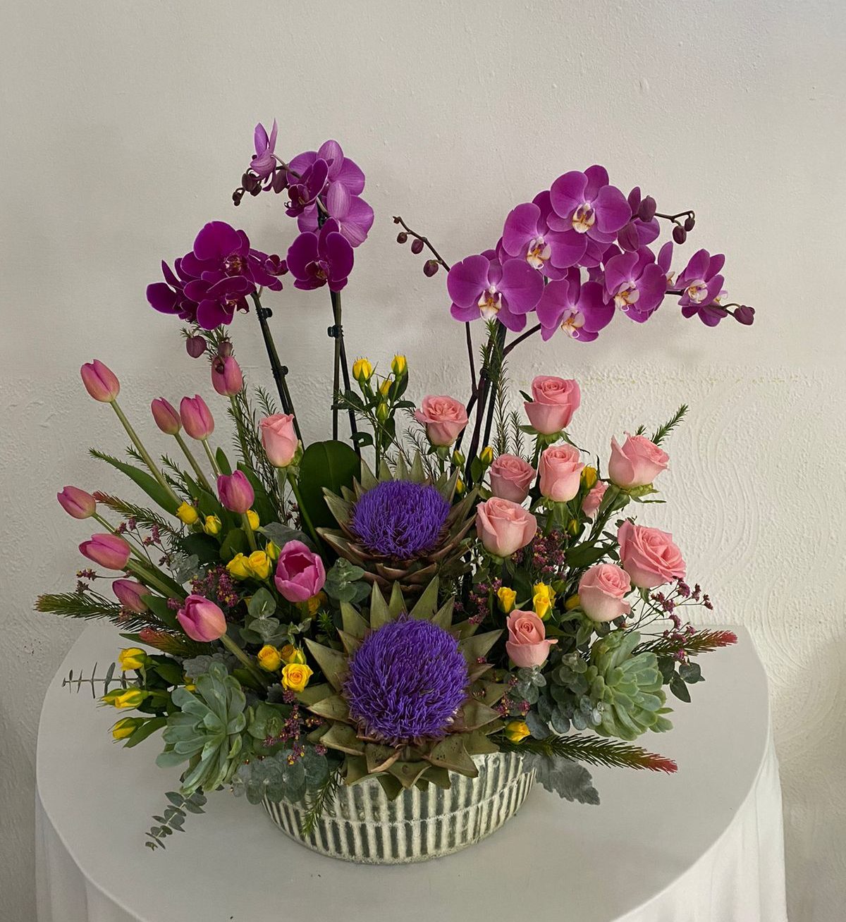 Las orquídeas aportan un toque de distinción y longevidad, mientras que las rosas y tulipanes añaden volumen y color vibrante. Ideal para ocasiones especiales que merecen una presentación refinada y memorable.