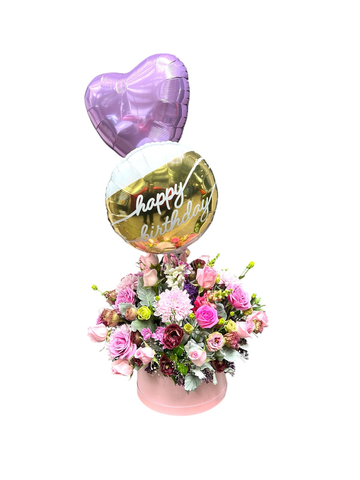 Caja cumpleañera elegante que combina rosas frescas con delicados lisianthus y globos decorativos. Un arreglo sofisticado diseñado para celebrar momentos especiales con estilo.