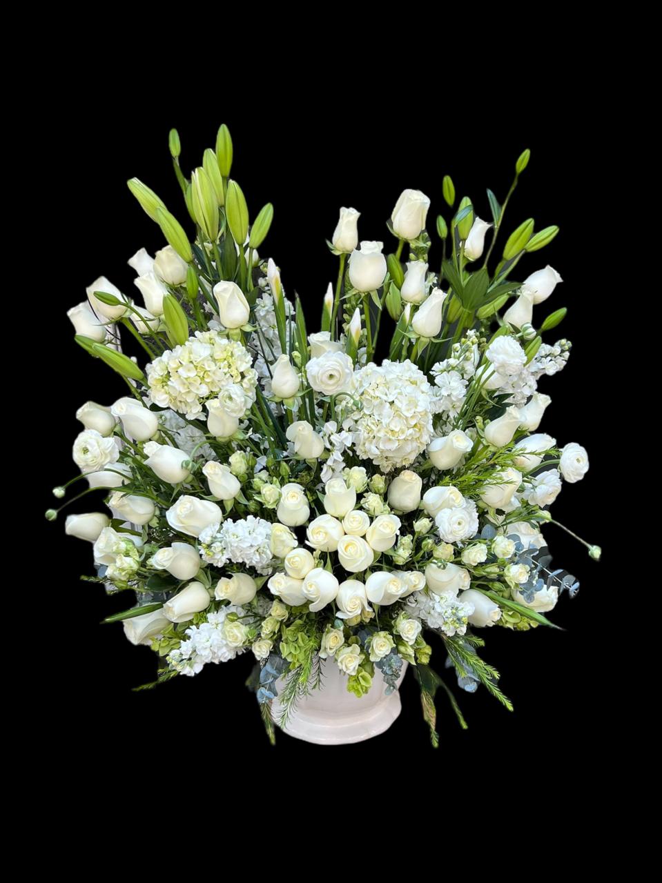Eterno Recuerdo es un arreglo floral de diseño sofisticado que combina la majestuosidad de las casablancas con la voluptuosidad de las hortensias y la delicadeza de la matiola. Esta composición cuidadosamente seleccionada crea una pieza de gran impacto visual, ideal para expresar sentimientos profundos en momentos significativos.