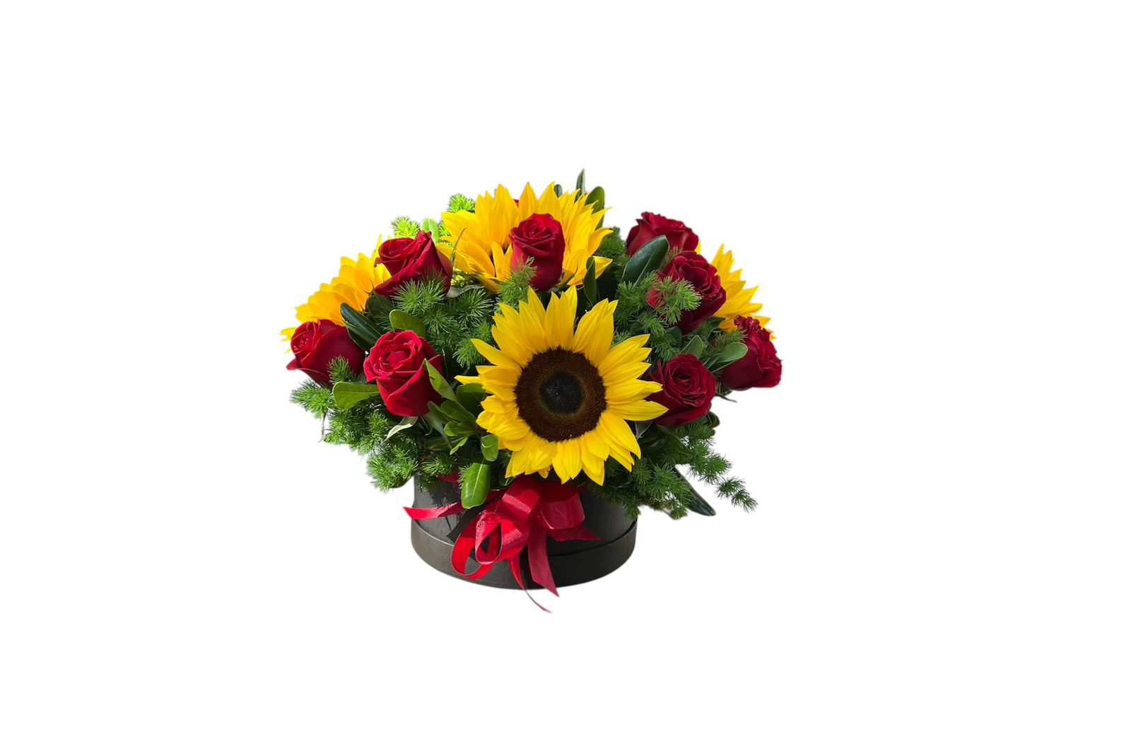 Descubre la elegancia en cada pétalo. Esta caja reúne rosas premium con girasoles vibrantes, creando un contraste sofisticado entre la delicadeza y la calidez.