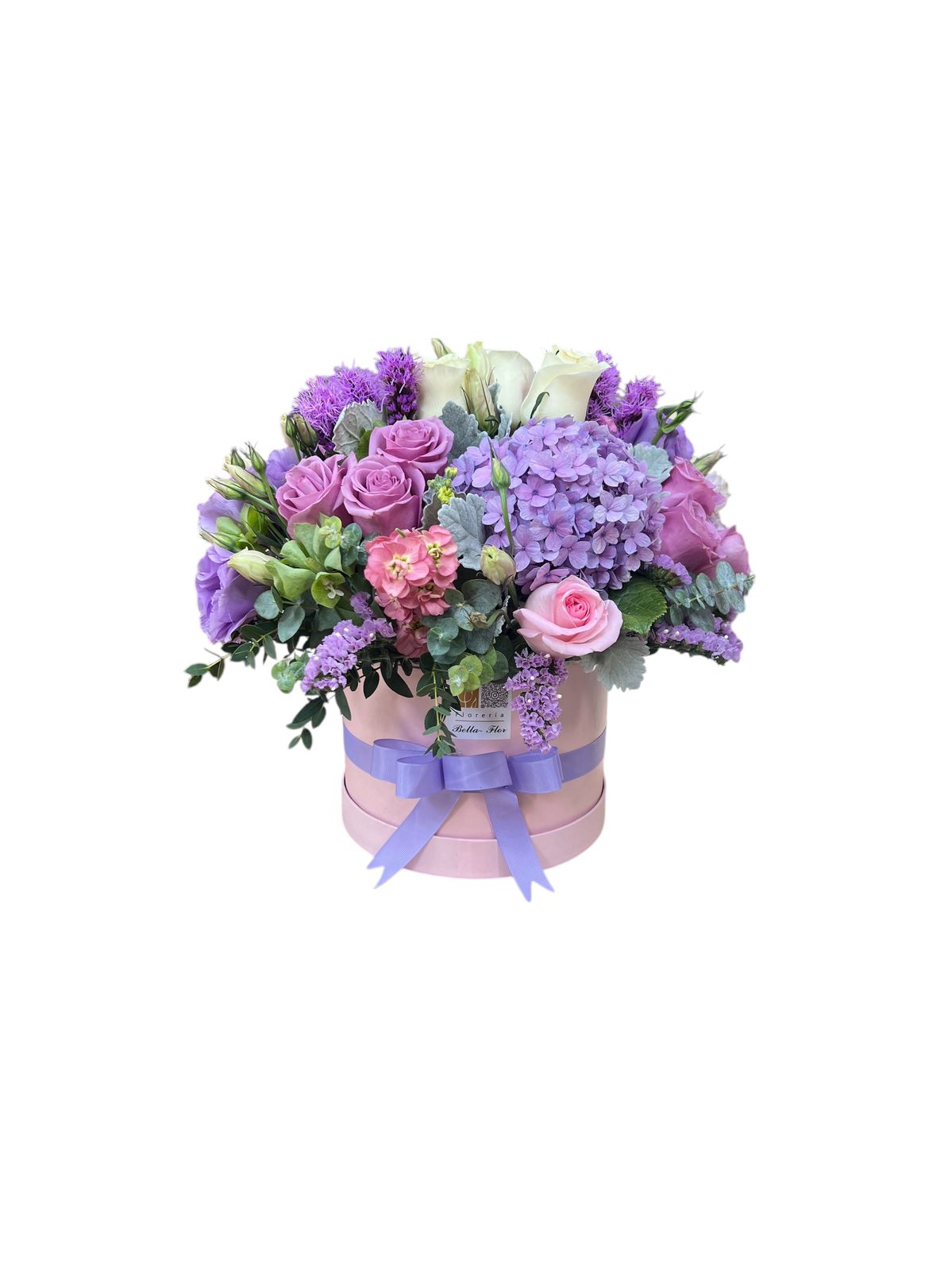 Arreglo floral elegante que combina rosas y hortensias en delicados tonos lila, creando una composición sofisticada y armoniosa.