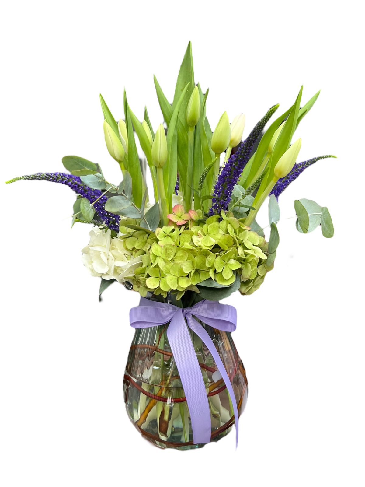 Florero de tulipanes con diseño elegante que realza la belleza natural de estas flores icónicas. Su estructura refinada proporciona estabilidad óptima mientras permite que los tallos se distribuyan de manera armoniosa.